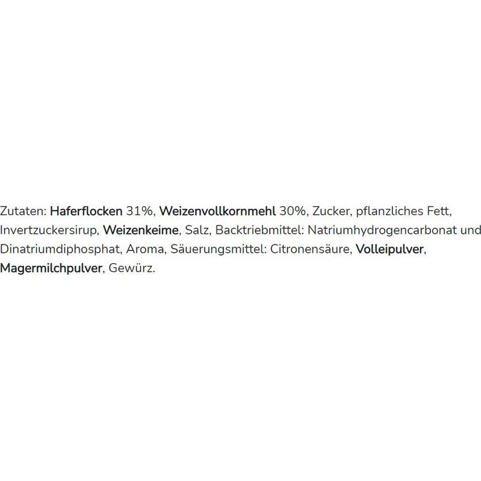 HAFERFLOCKEN 31 %, WEIZENVOLLKORNMEHL 30 %, Zucker, pflanzliches Fett, Invertzuckersirup, WEIZENKEIME, Salz, Backtriebmittel: Natriumcarbonate, Diphosphate, Aroma, Säuerungsmittel: Citronensäure, HÜHNERVOLLEIPULVER, MAGERMILCHPULVER, Gewürz