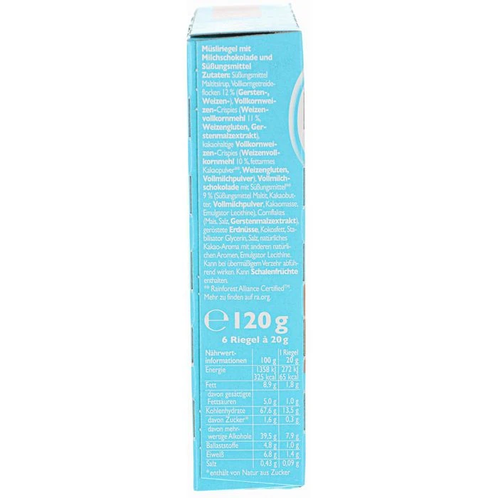 Zutaten: Süßungsmittel Maltitsirup, Vollkorngetreideflocken 12% (GERSTEN-, WEIZEN-), VOLLKORNWEIZEN-Crispies (WEIZENVOLLKORN-MEHL 11%, WEIZENGLUTEN, GERSTENMALZEXTRAKT), kakaohaltige VOLLKORN-WEIZEN-Crispies (WEIZENVOLLKORNMEHL 10%, fettarmes Kakaopulver, WEIZENGLUTEN, VOLLMILCHPULVER), VOLLMILCHSCHOKOLADE mit Süßungsmittel 9% (Süßungsmittel Maltit, Kakaobutter, VOLLMILCHPULVER, Kakaomasse, Emulgator Lecithine), Cornflakes (Mais, Salz, GERSTENMALZEXTRAKT), geröstete ERDNÜSSE, Kokosfett, Stabilisator Glycerin, Salz, natürliches Kakao-Aroma mit anderen natürlichen Aromen, Emulgator Lecithine