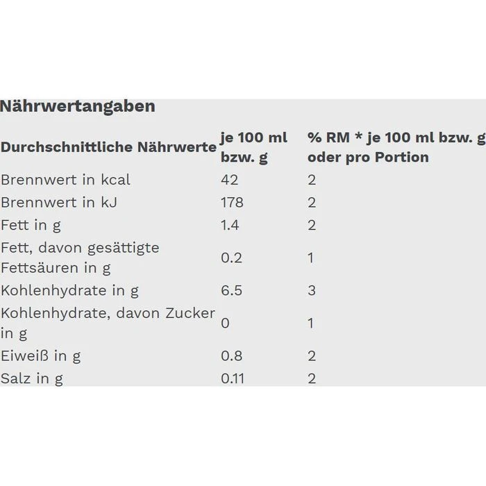 Zutaten: Wasser, 5% VOLLKORNHAFER**, Sonnenblumenöl**, Meersalz, Stabilisator: Guarkernmehl**