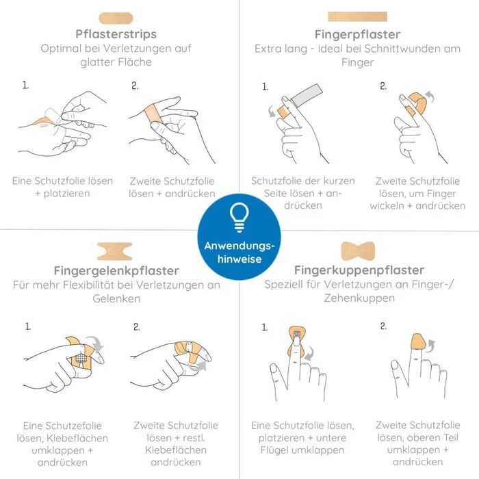 • 8 x Fingergelenkverband (7,5 x 3,8 cm), 22 x Strip (7,2 x 2,5 cm)
