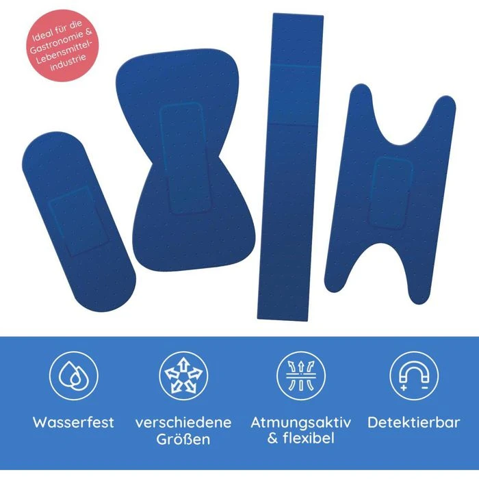 • Pflaster sind elektromagnetisch detektierbar und blau eingefärbt