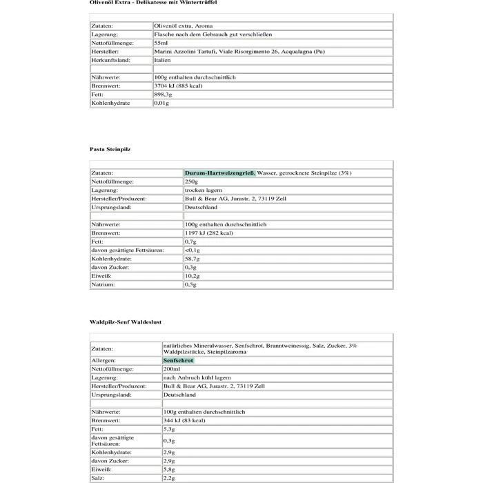 • Geschenkset mit Bandnudeln, Pilzen, Olivenöl, Trüffelbutter und Pilz-Senf