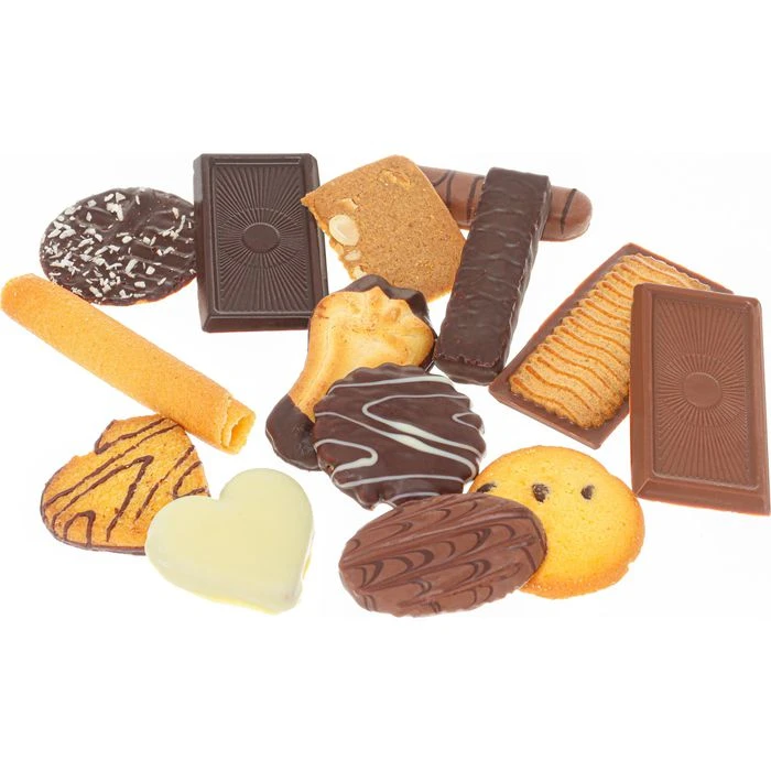 Zutaten: WEIZENMEHL, Zucker, pflanzliche Fette (Palm, Kokos), Kakaomasse, Kakaobutter, Farinzucker, BUTTERREINFETT, VOLLMILCHPULVER, SÜßMOLKENPULVER, MAGERMILCHPULVER, WEIZENSTÄRKE, fettarmes Kakaopulver, flüssiges HÜHNEREIEIWEIß, Invertzuckersirup, Dextrose, MANDELN, Emulgatoren: Lecithine (SOJA), Mono- und Diglyceride von Speisefettsäuren; Kokosraspeln, Glukosesirup, Glukose-Fruktose-Sirup, MILCHZUCKER, Salz, Backtriebmittel: Natriumcarbonate, Diphosphate, Ammoniumcarbonate; natürliches Aroma, VOLLEIPULVER, Rapsöl, MILCHEIWEIß, HÜHNERTROCKENEIEIWEIß, flüssiges HÜHNEREIEIGELB, Karamellzuckersirup, Gewürze, GERSTENMALTEXTRAKT, Vanilleextrakt, Farbstoff: Beta-Carotin, Ammoniumsulfit-Zuckerkulör.
