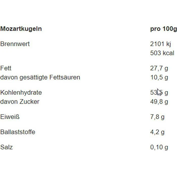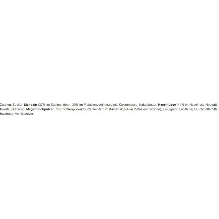 Zutaten: Zucker, MANDELN (37% im Edel-Marzipan, 30% im Pistazienmarzipan), Kakaomasse, Kakaobutter, HASELNÜSSE (41% im Haselnuss-Nougat), Invertzuckersirup, MAGERMILCHPULVER, SÜßMOLKENPULVER, BUTTERREINFETT, PISTAZIEN (6,5% im Pistazienmarzipan), Emulgator: Lecithine; Feuchthaltemittel: Invertase; Vanillepulver