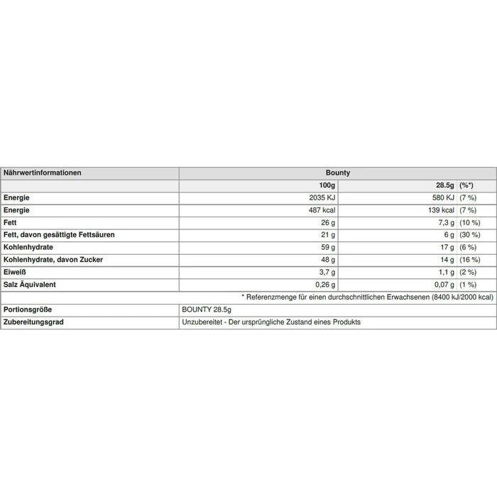 BOUNTY – Zucker, Kokosraspel (21%), Glukosesirup, Kakaobutter, Kakaomasse, MAGERMILCHPULVER, Emulgatoren (SOJALECITHIN, E471), MILCHZUCKER, Butterreinfett (aus MILCH), Süssmolkenpulver (aus MILCH), Feuchthaltemittel (Glycerin), Salz, natürlicher Vanilleextrakt.