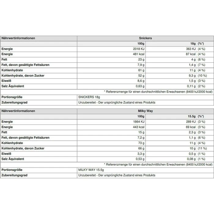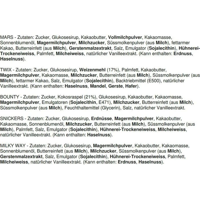 SNICKERS – Zucker, Glukosesirup, ERDNÜSSE, MAGERMILCHPULVER, Kakaobutter, Kakaomasse, Sonnenblumenöl, MILCHZUCKER, Butterreinfett (aus MILCH), Süssmolkenpulver (aus MILCH), Palmfett, Salz, Emulgator (SOJALECITHIN), HÜHNEREI-TROCKENEIWEISS, MILCHEIWEISS, natürlicher Vanilleextrakt.