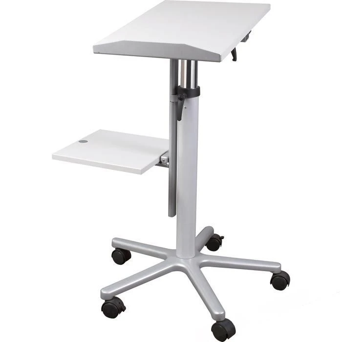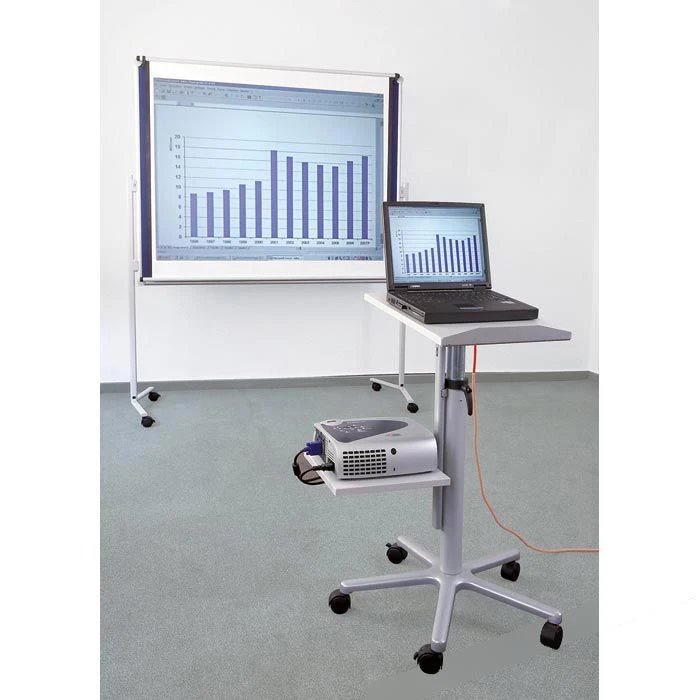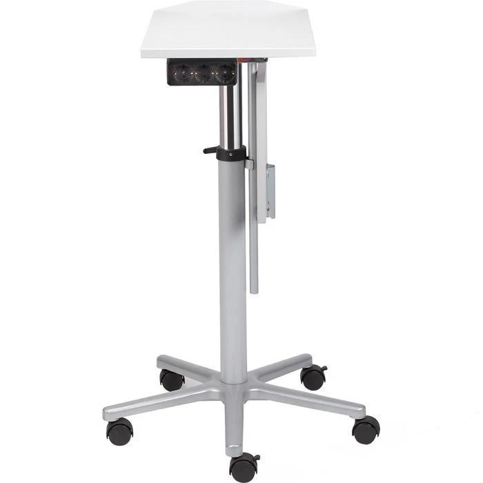 sonstiges: Ablagefläche ist stufenlos höhenverstellbar und sanft absenkbar durch Airpolster-Technik, kein überraschendes Durchsacken, Tischplatte um 10° nach vorn neigbar, Fußkreuz aus Aluminium mit 5 Leichtlauf-Schwenkrollen, davon 2 feststellbar, mit 3-fach Steckdose und 3 m langem, rotem Kabel (Signalfarbe), edle Oberfläche durch Hellgrau-Feinstruktur