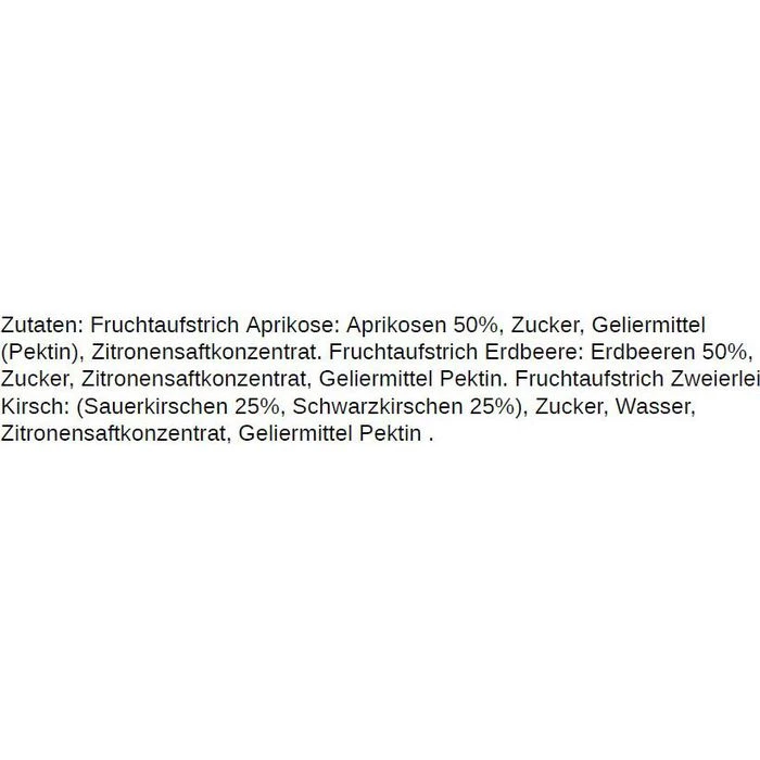 Fruchtaufstrich Zweierlei Kirsch: (Sauerkirschen 25%, Schwarzkirschen 25%), Zucker, Wasser, Zitronensaftkonzentrat, Geliermittel Pektin .
