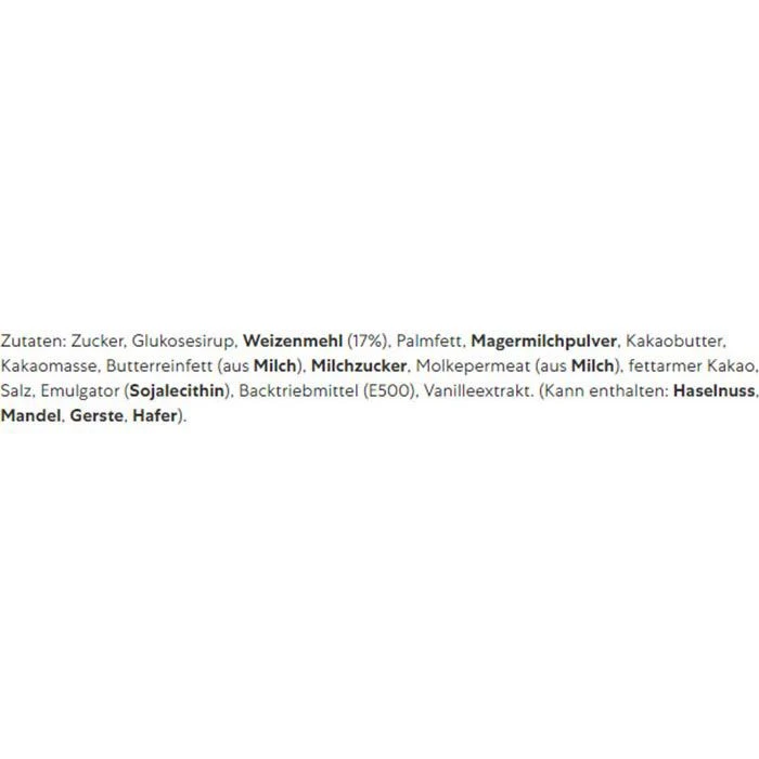 Zutaten: Zucker, Glukosesirup, WEIZENMEHL (17%), Palmfett, Kakaobutter, MAGERMILCHPULVER, Kakaomasse, MILCHZUCKER, Butterreinfett (aus MILCH), Süßmolkenpulver (aus MILCH), fettarmer Kakao, Salz, Emulgator (SOJALECITHIN), Backtriebmittel (E500), natürlicher Vanilleextrakt